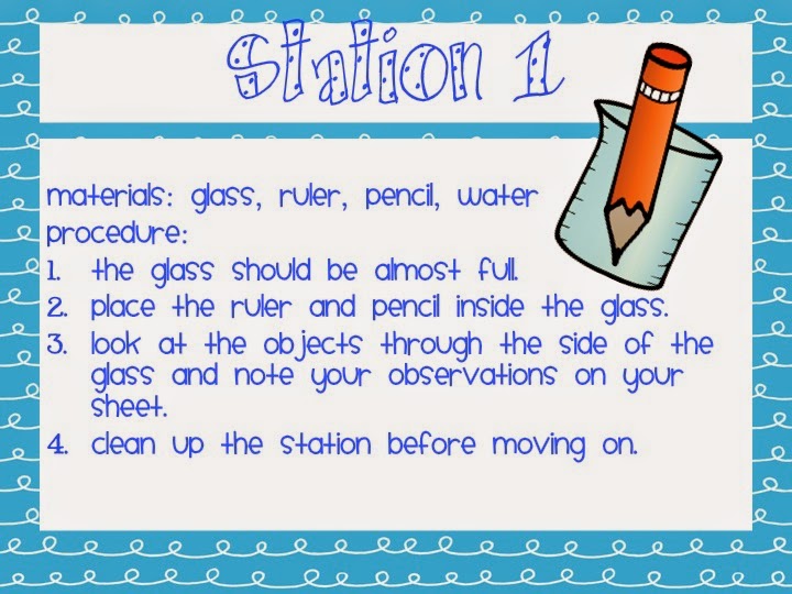 Today we did lab stations. There were six stations in total. They cover reflection, refraction, white light, and transparent, translucent and opaque. Each station has a laminate card with the materials needed and the directions. This is what I spent my Sunday morning doing!